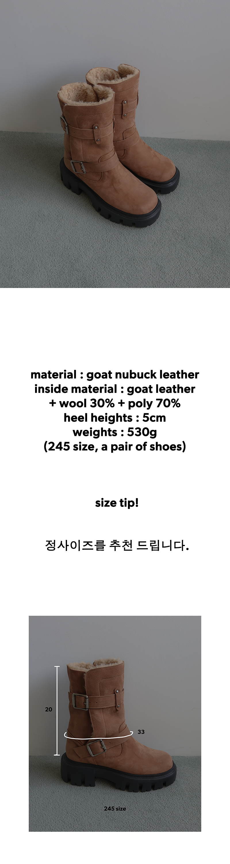 3. 사이즈 교환은 제품의 색상변경, 발볼 등 디자인 수정을 하지 않은 경우에만 1회 가능합니다. (배송비 왕복 6,000원 동봉 또는 계좌이체 후 착불로 보내주세요.)
