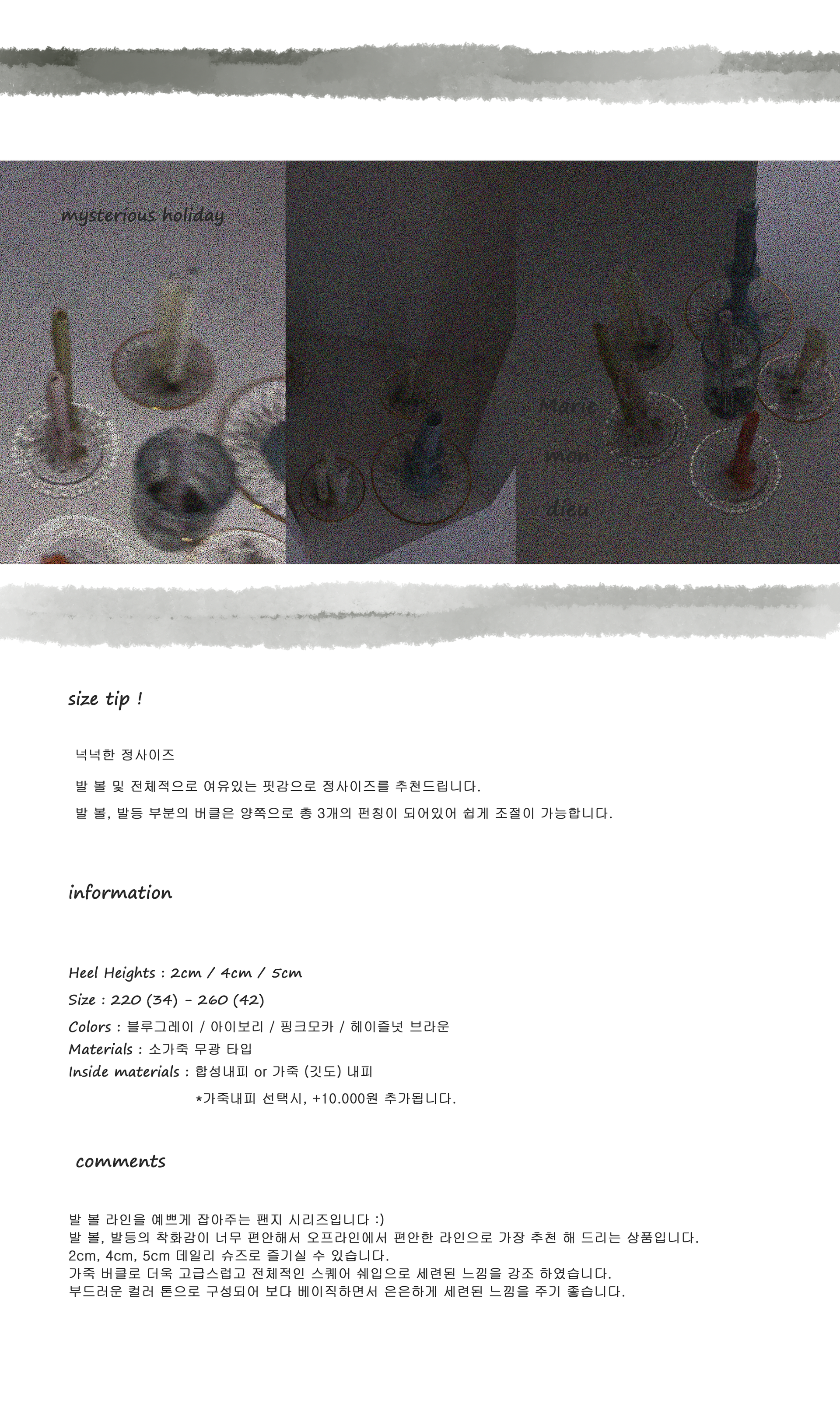 3. 사이즈 교환은 제품의 색상변경, 발볼 등 디자인 수정을 하지 않은 경우에만 1회 가능합니다. (배송비 왕복 6,000원 동봉 또는 계좌이체 후 착불로 보내주세요.)